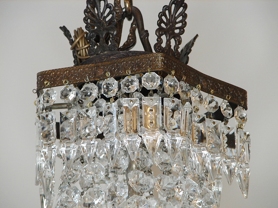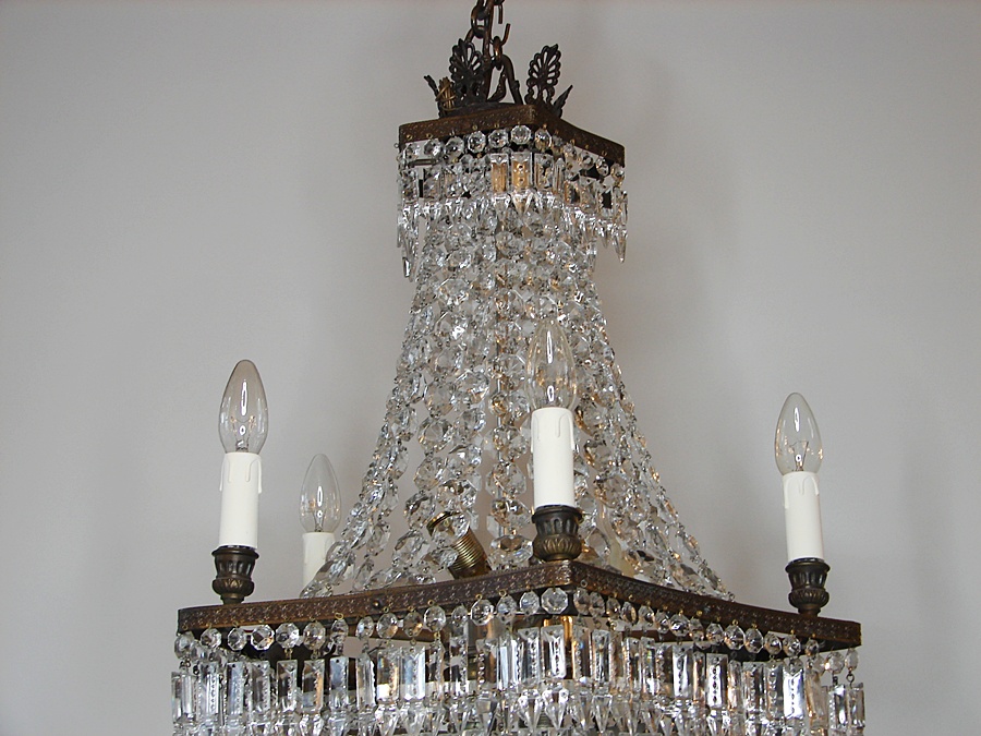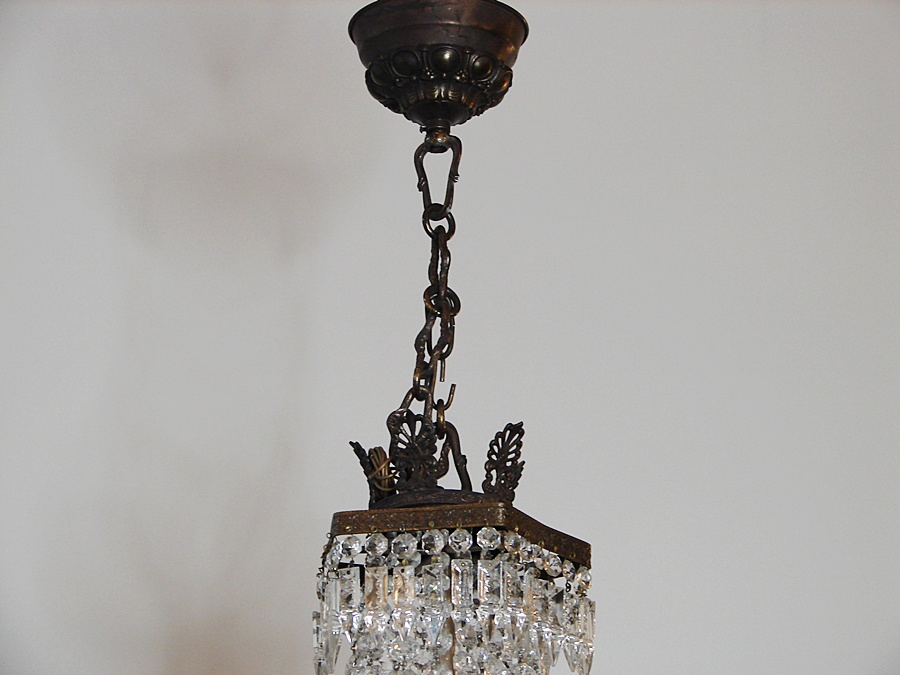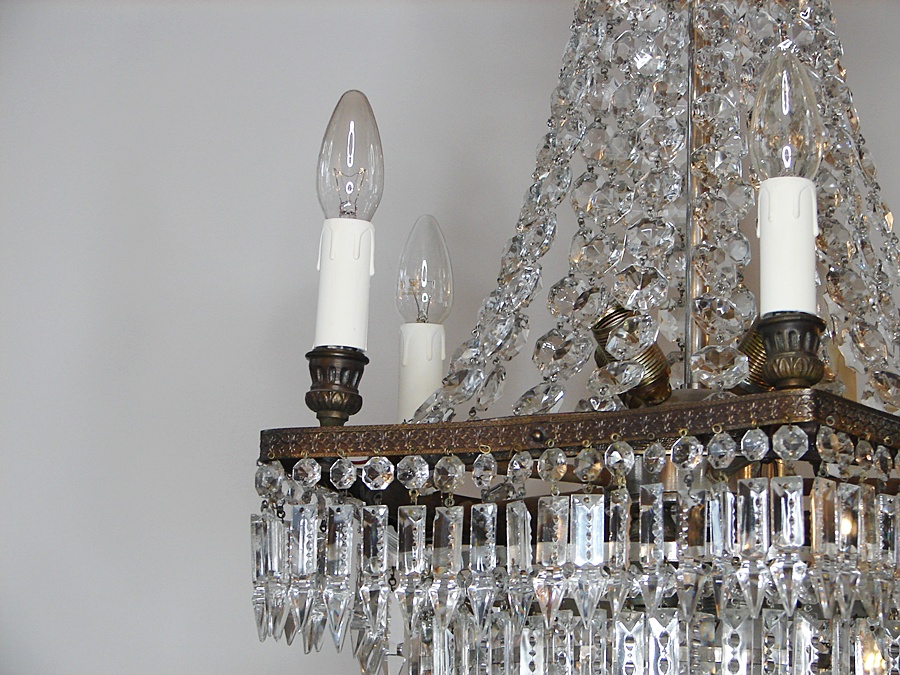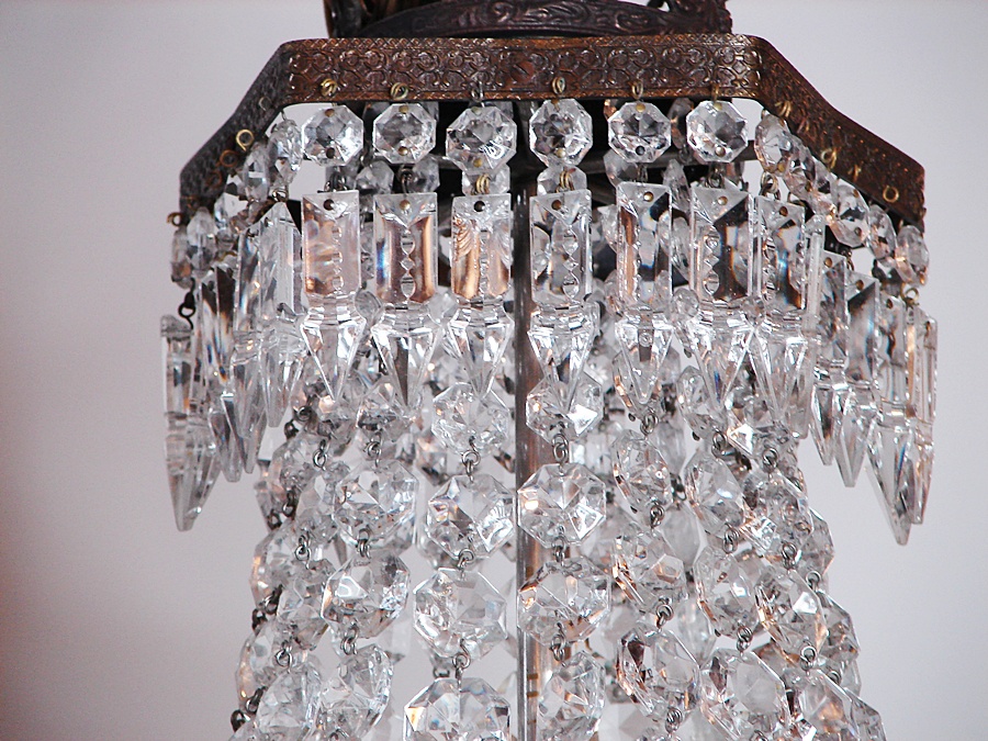 Salonowa lampa z kryształów, które odbijając światło wzmacniają efekt jasności i dodają blasku. Wykonana na początku XX wieku, poddana renowacji
