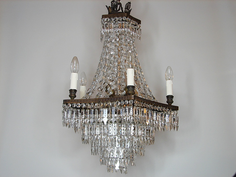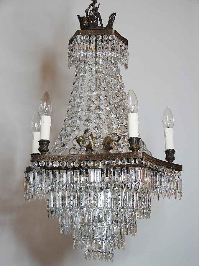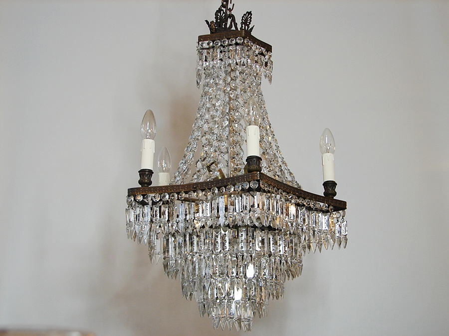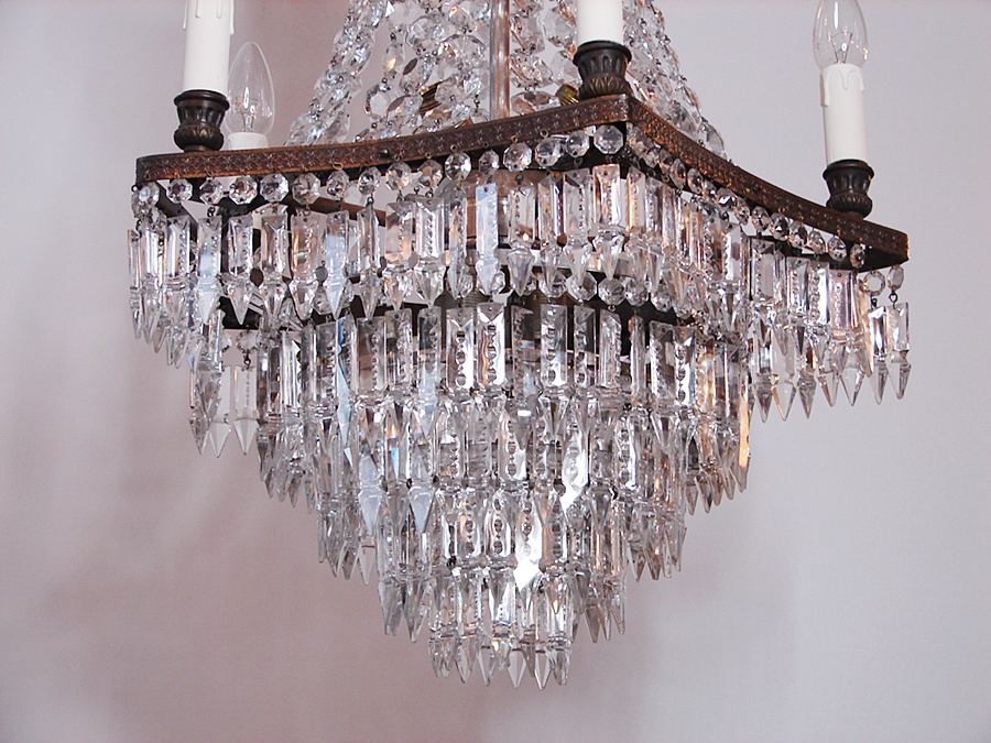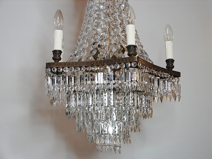 Salonowa lampa z kryształów, które odbijając światło wzmacniają efekt jasności i dodają blasku. Wykonana na początku XX wieku, poddana renowacji