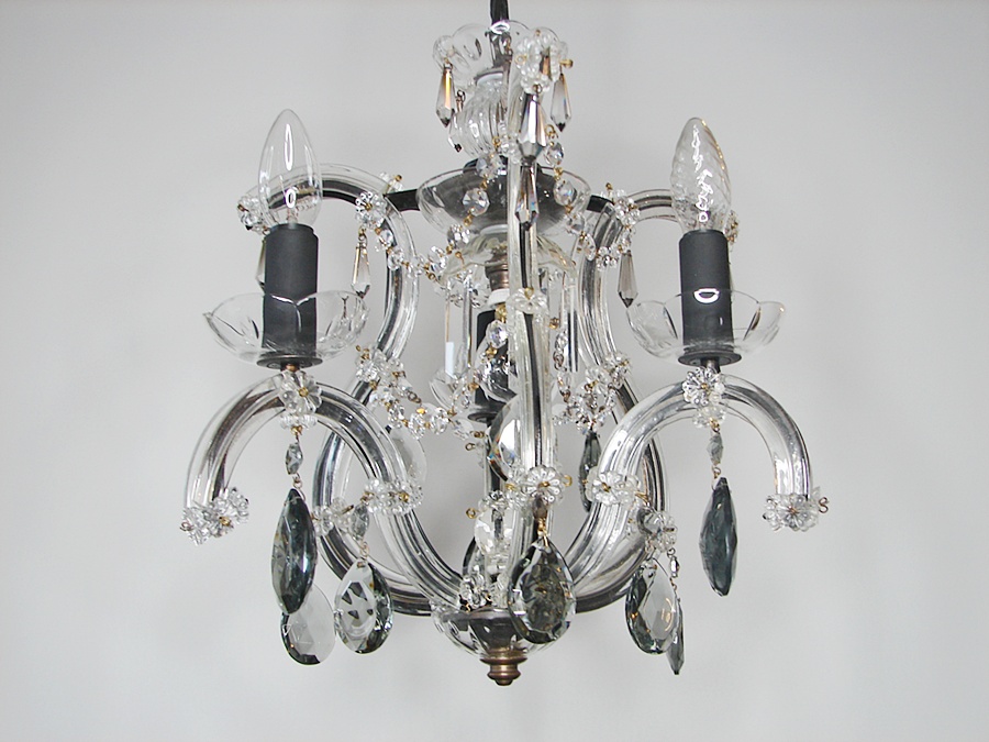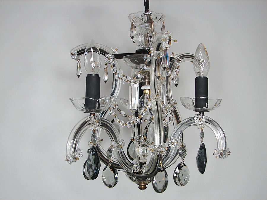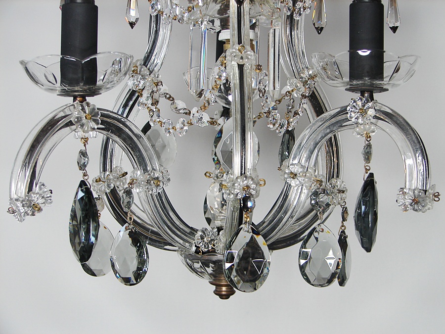 Ż yrandol w stylu Maria Teresa,po renowacji,zdobiony ciemnymi krysztalami .