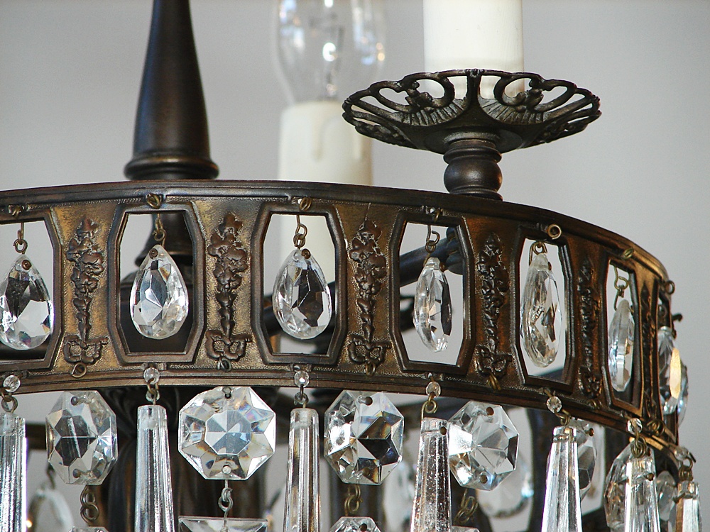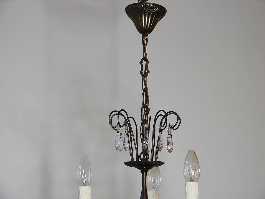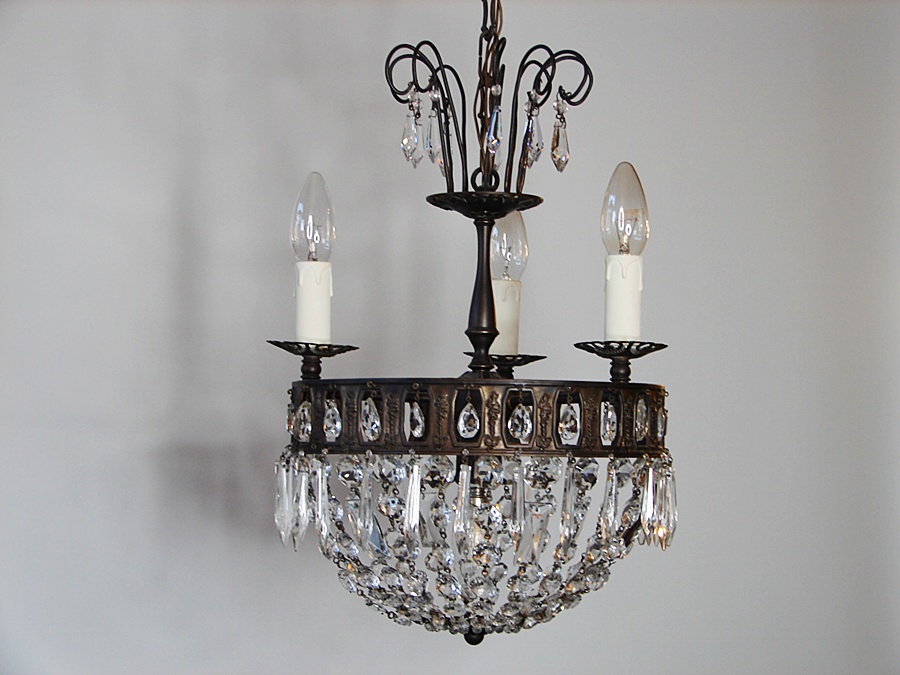 PIĘKNY KRYSZTAŁOWY ŻYRANDOL WYKONANY Z MOSIĄDZU Z PRZEŁOMU XX WIEKU.
