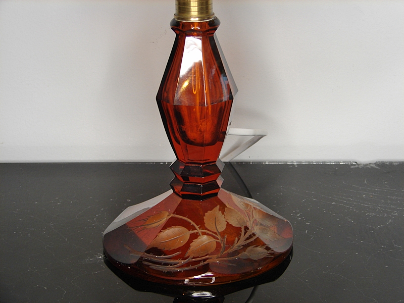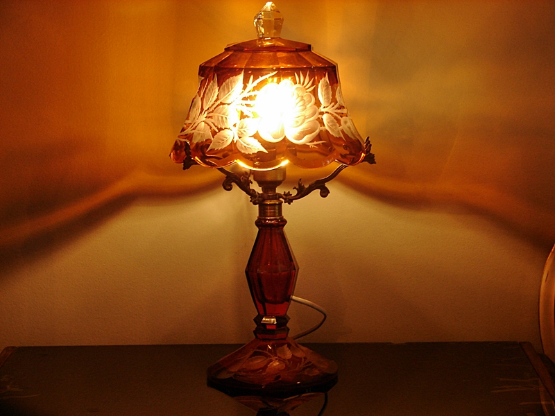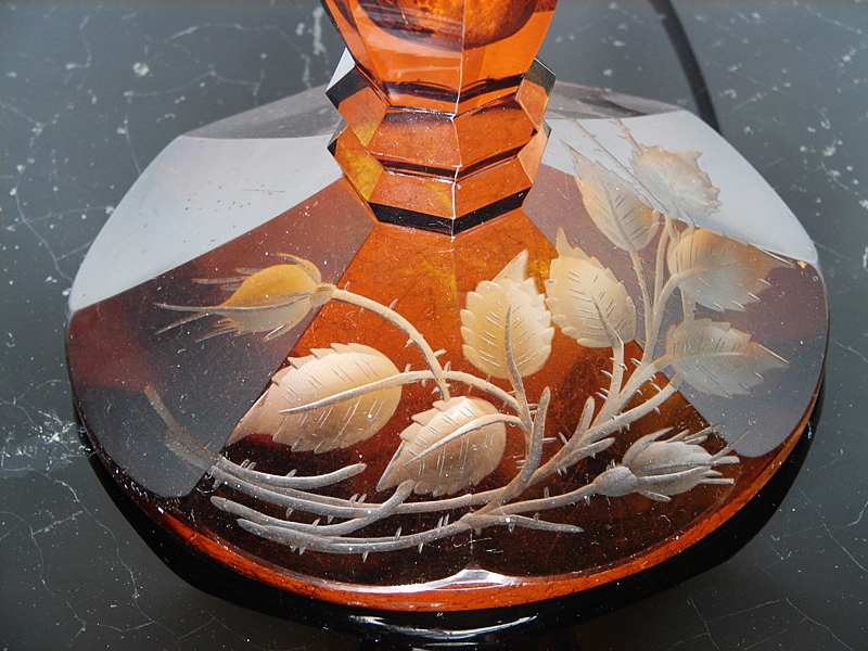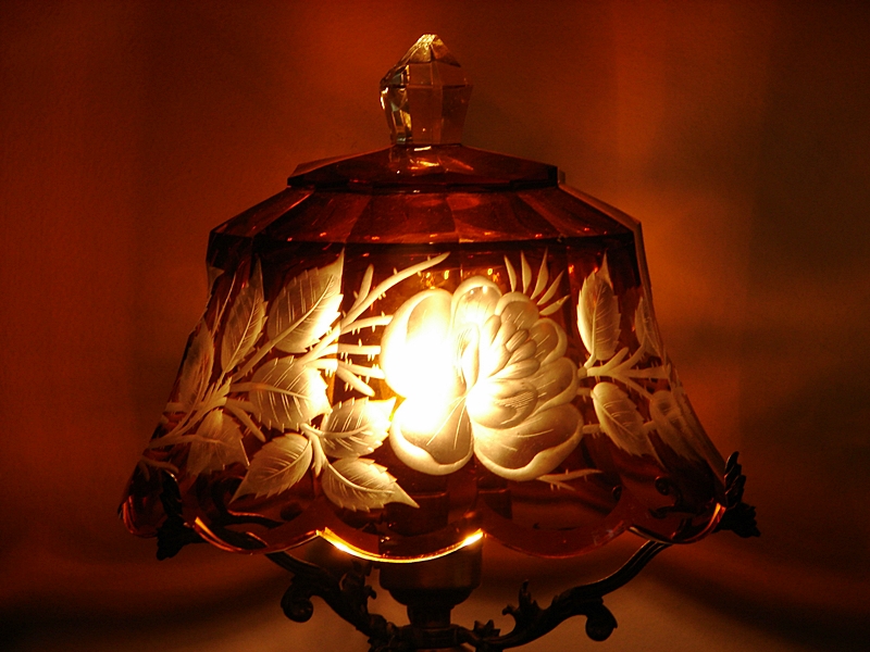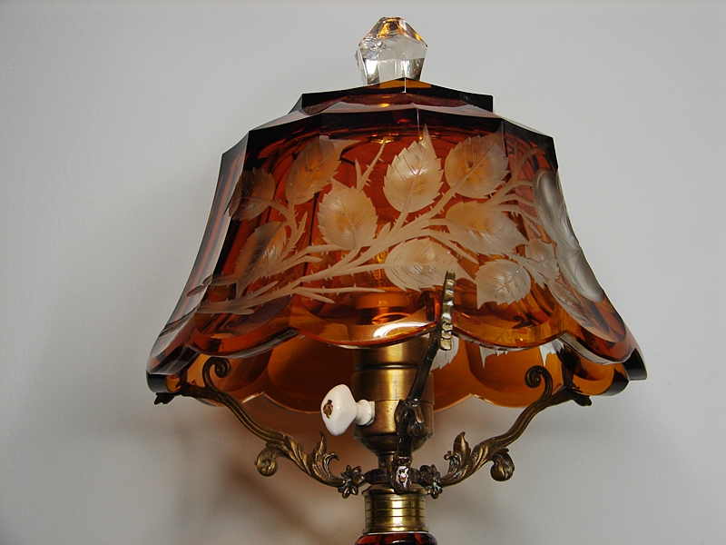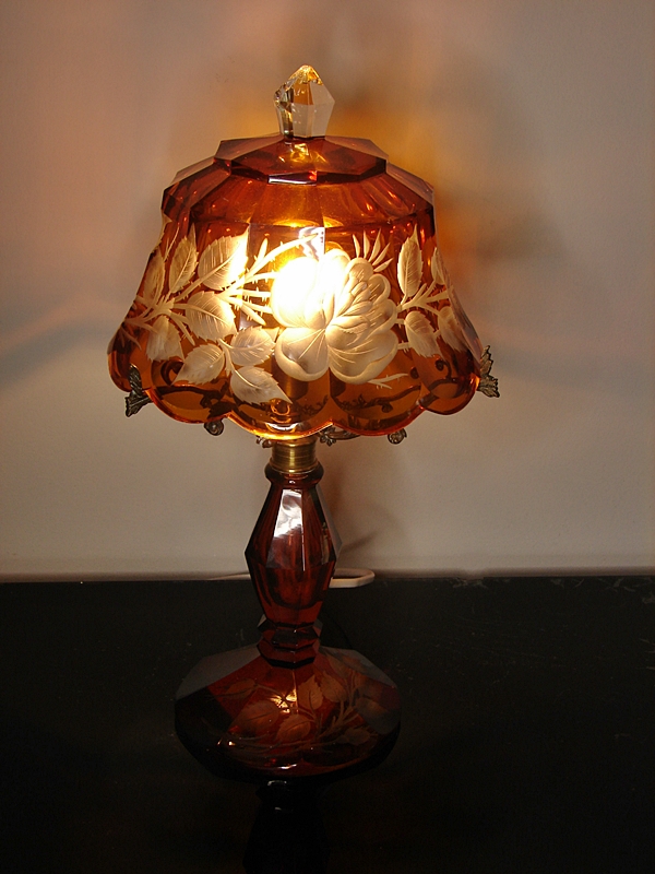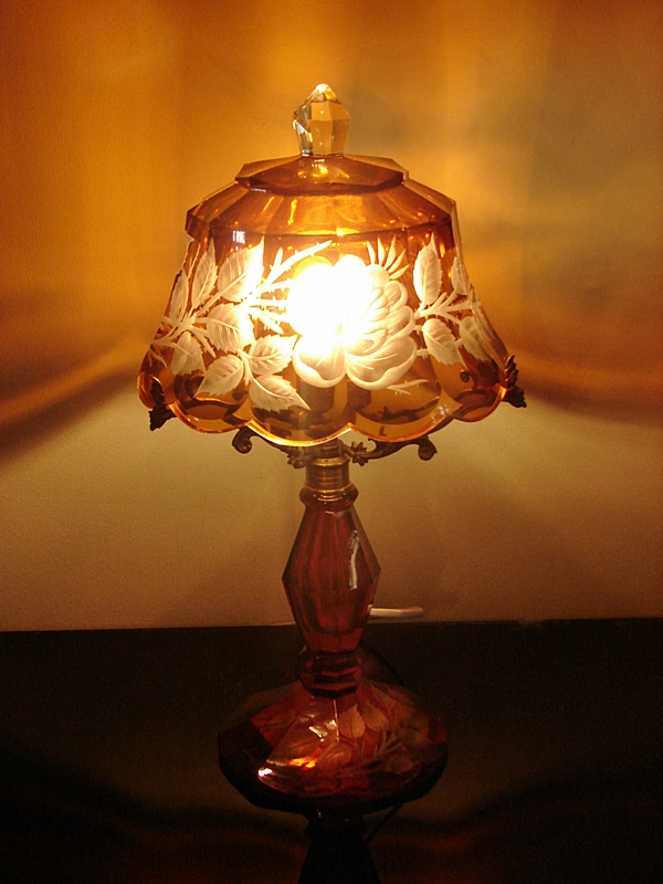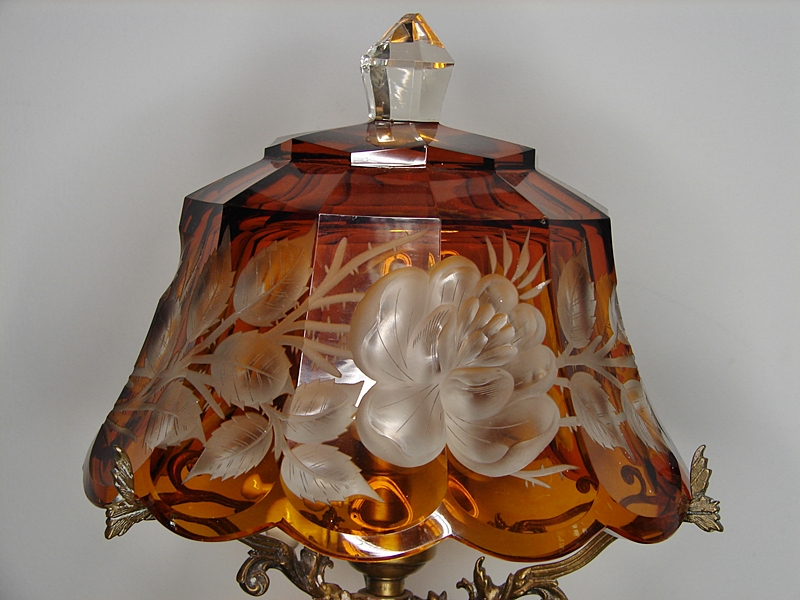 Wykonana z barwionego na kolor bursztynowy szkła ,podstawa i klosz zdobione w motywy różane.
